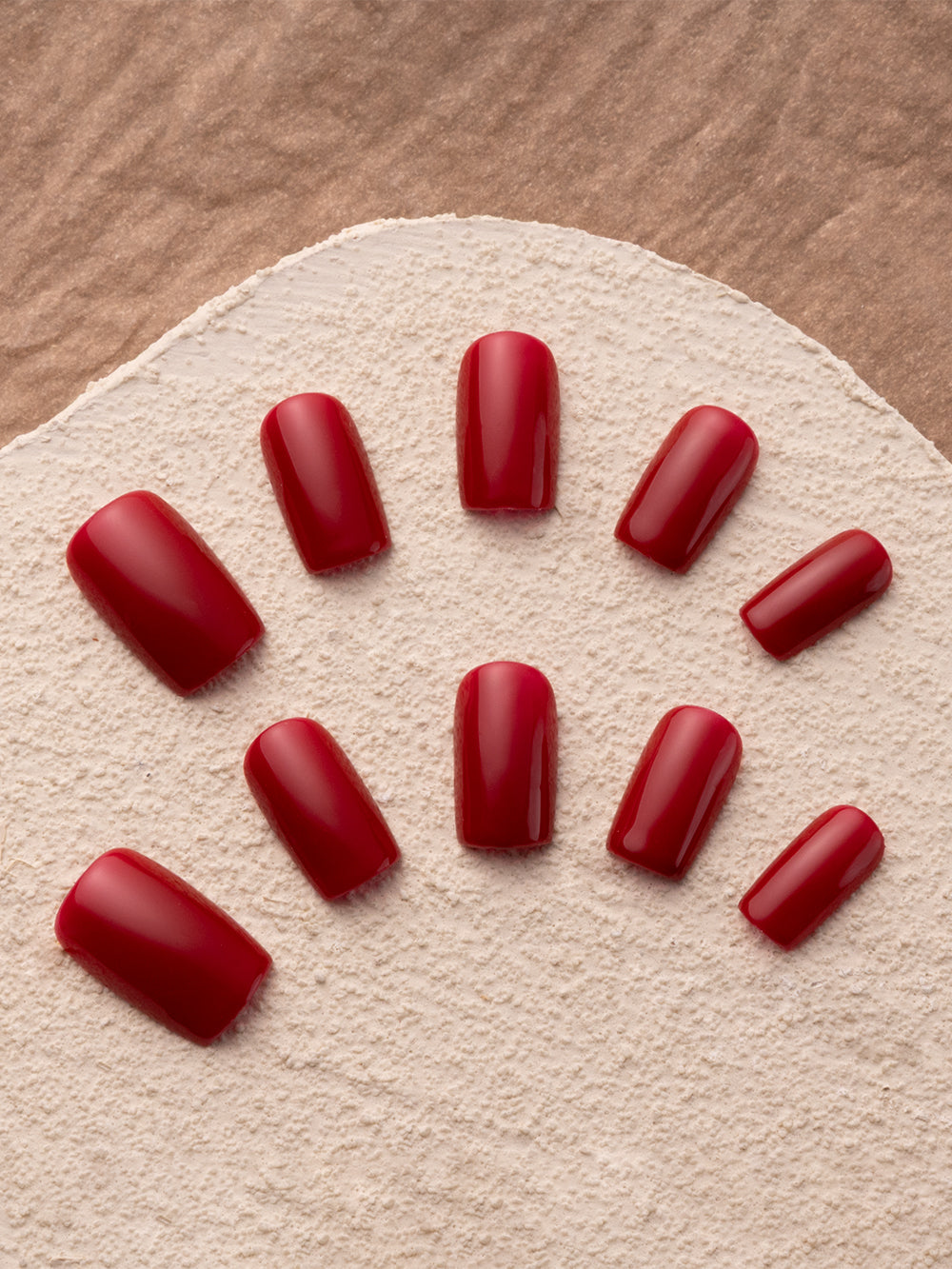 Façonnés 100 % à la main avec un gel professionnel de haute qualité, ces press-on nails réutilisables incarnent la puissance et la pureté du rouge carmin, avec une finition impeccable et lisse.