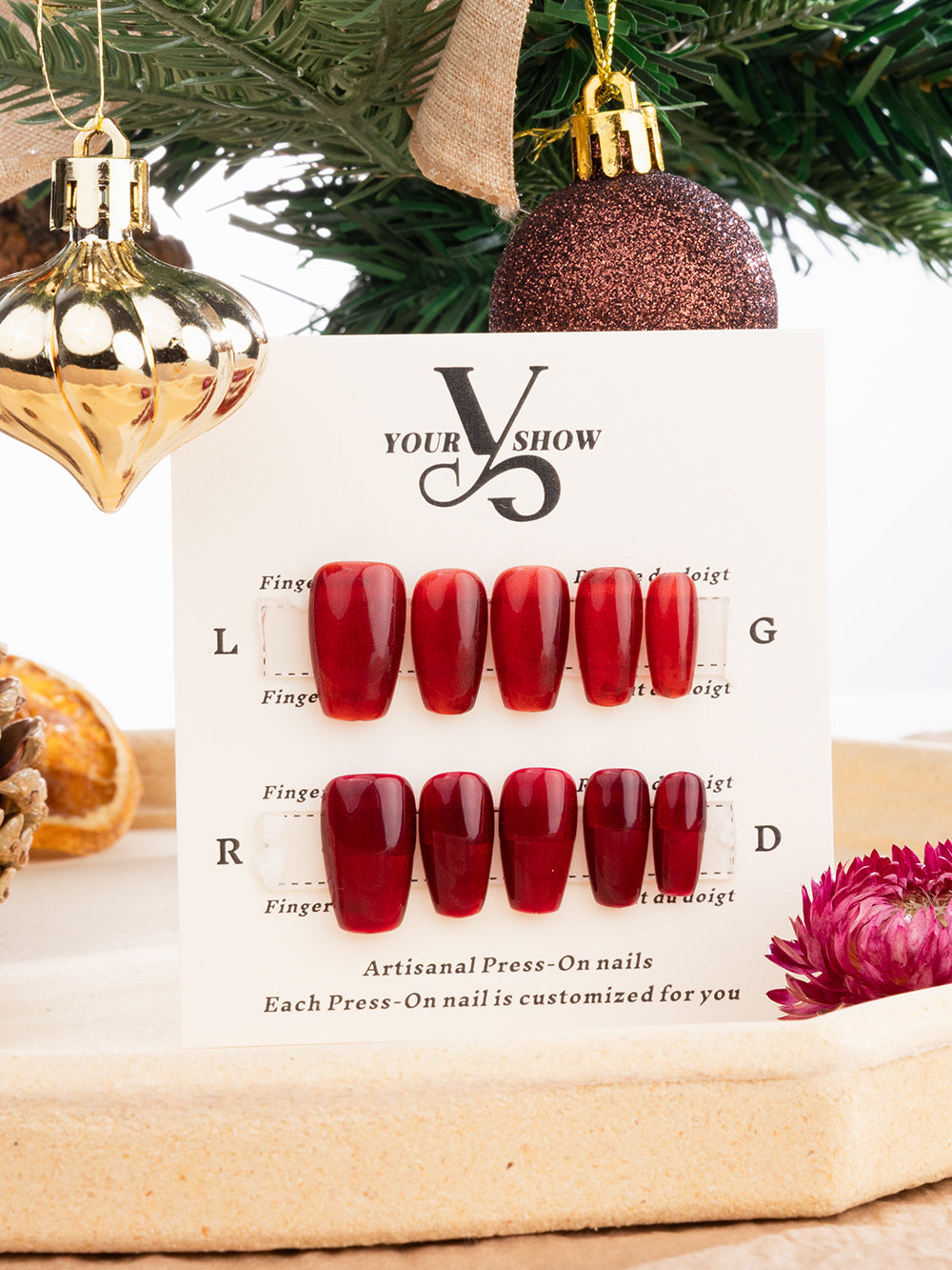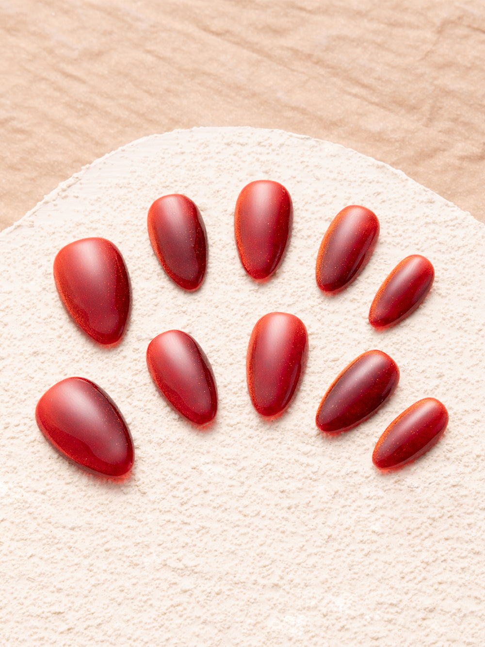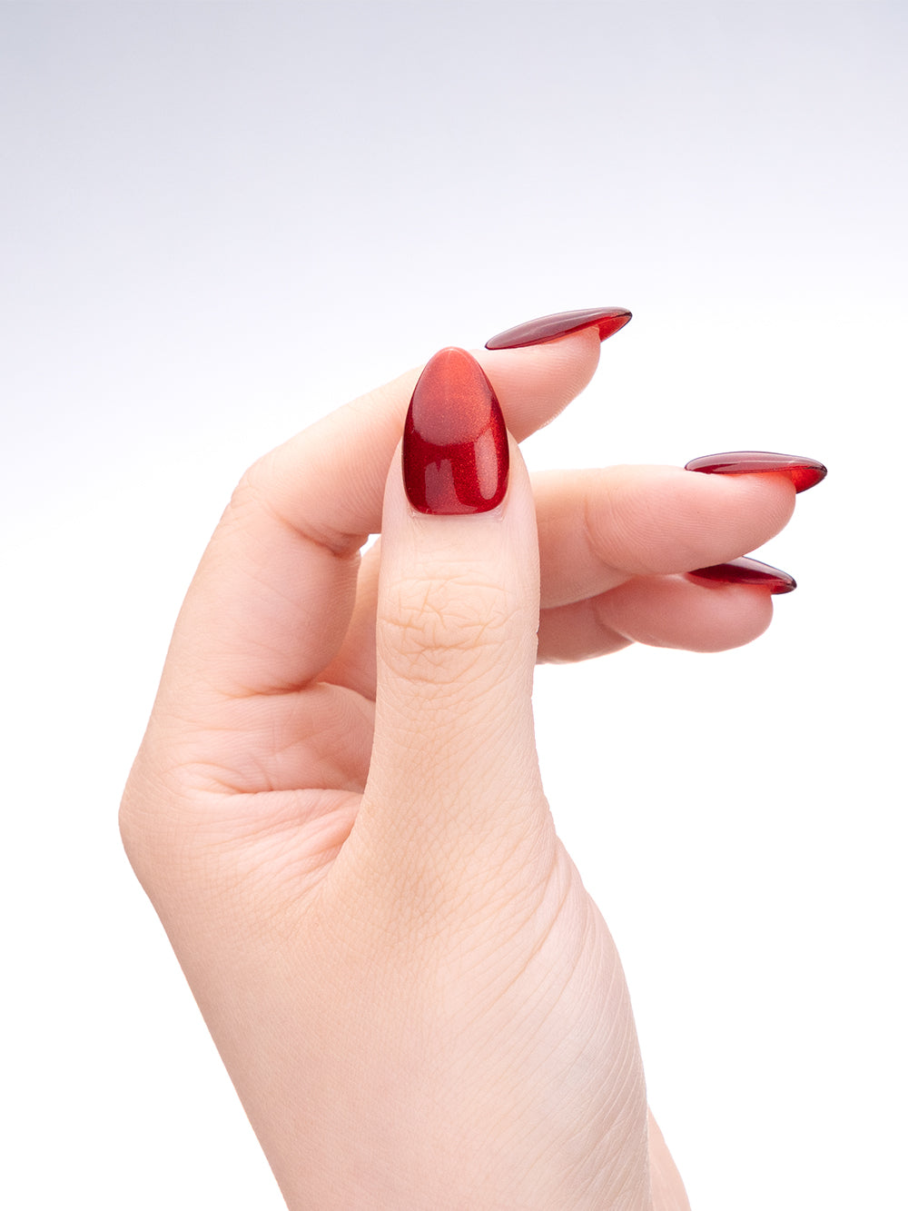 Laissez-vous séduire par les faux ongles artisanaux Rubis Hiver, un rouge profond au magnétisme subtil, illuminé par un effet œil-de-chat élégant et raffiné.