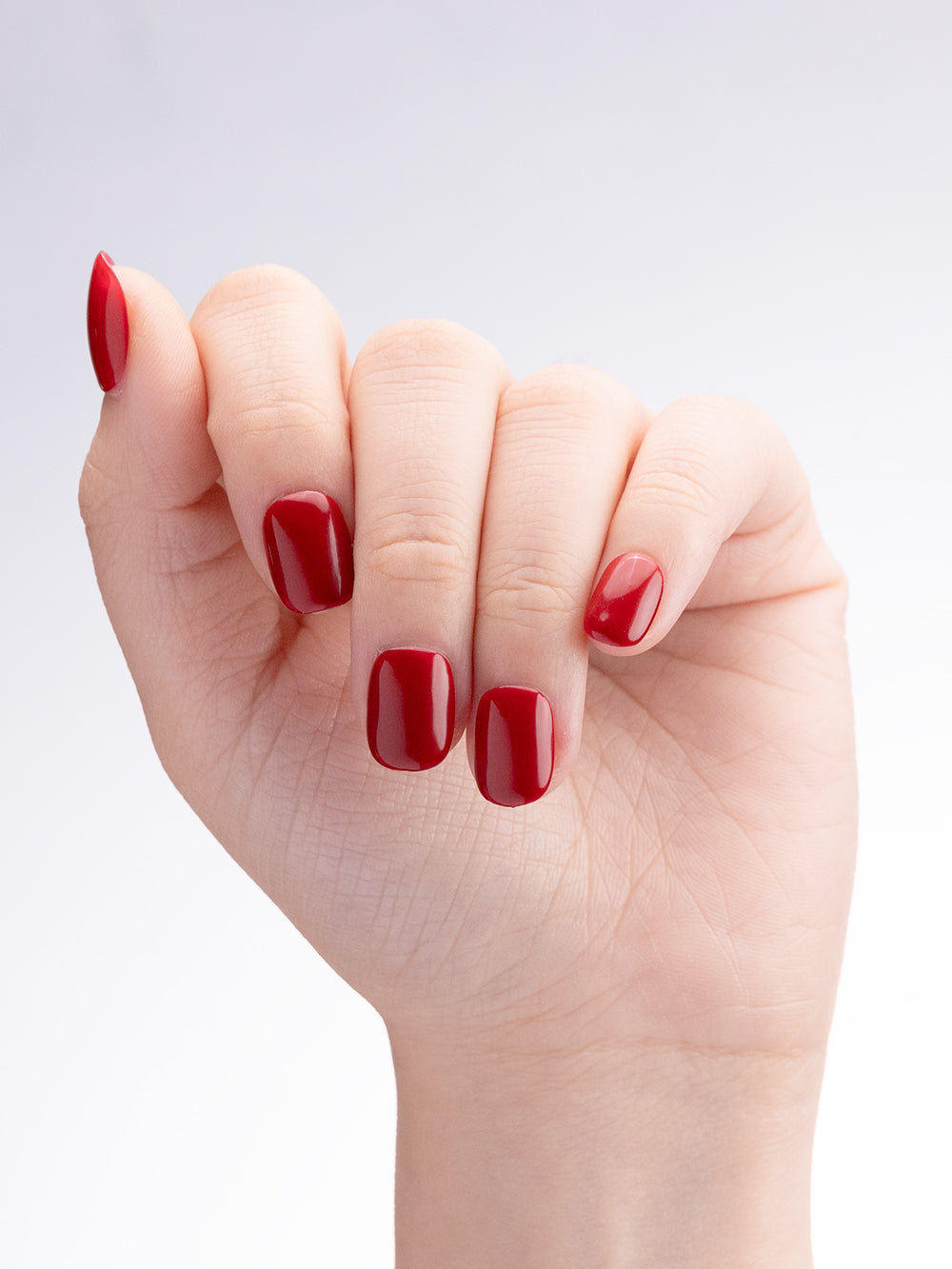 Apportez une touche de douceur éclatante à vos mains avec les faux ongles artisanaux Carmin Doux, un rouge pur et vibrant. La forme courte et arrondie offre une élégance simple et naturelle.