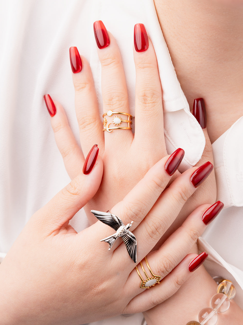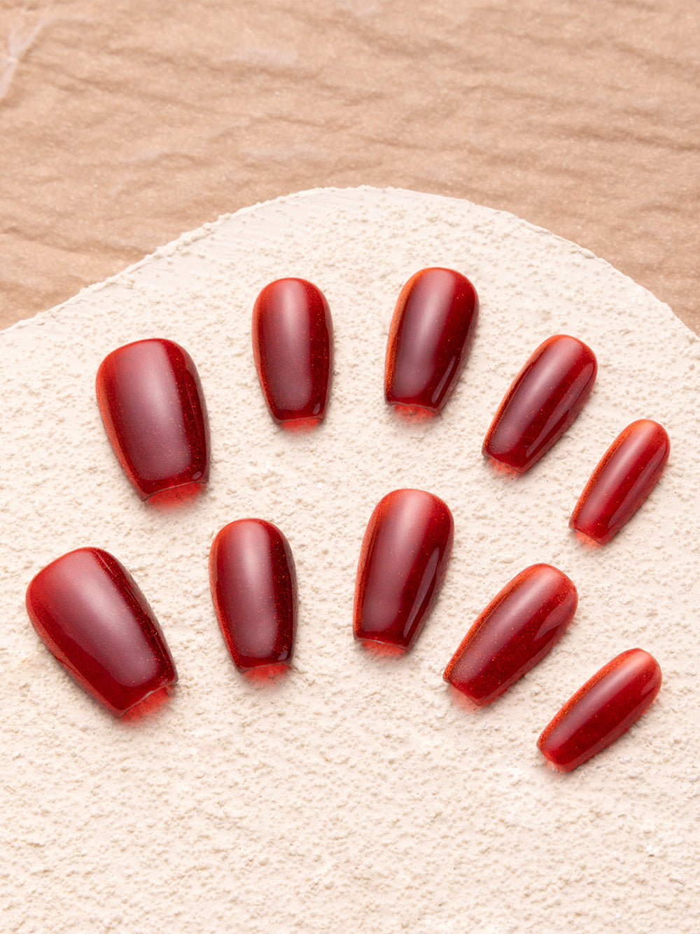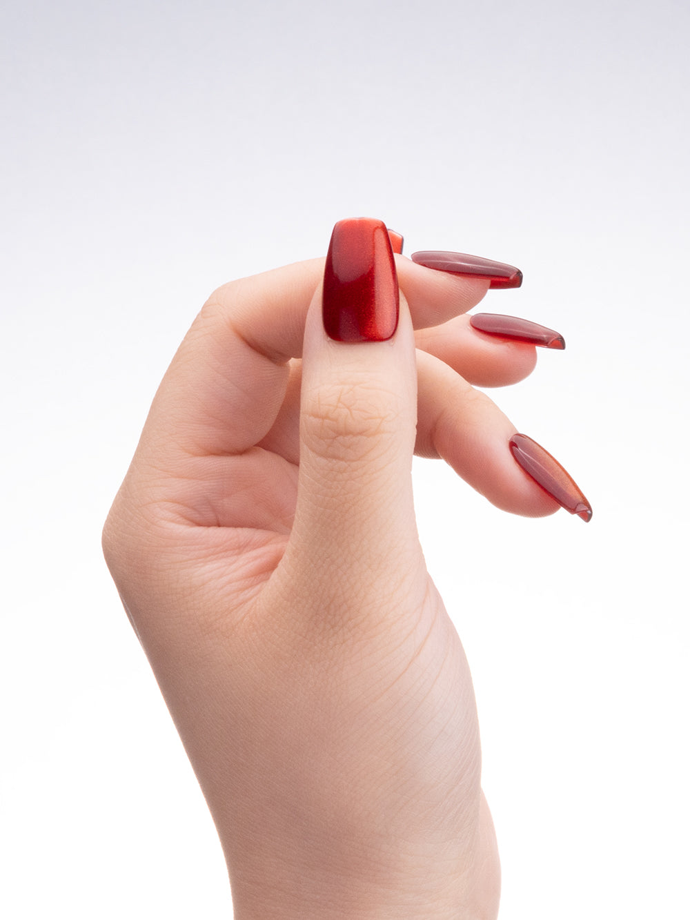 Découvrez nos faux ongles artisanaux Rubis Noël, un rouge profond sublimé par un effet œil-de-chat lumineux qui danse avec la lumière, comme un éclat de fête au cœur de l’hiver.