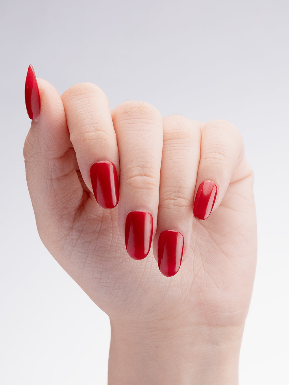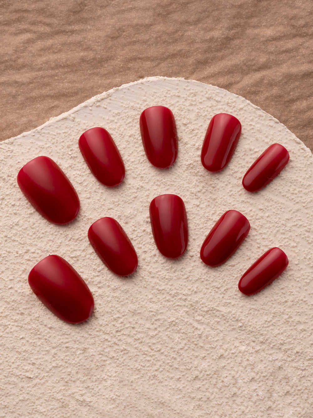 Sublimez votre style avec les faux ongles artisanaux Carmin Élégant, un rouge carmin pur et vibrant. La forme courte ovale allonge délicatement la silhouette des doigts tout en offrant une allure simple et chic.