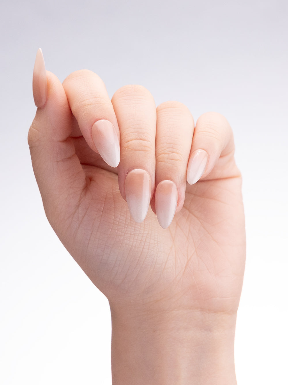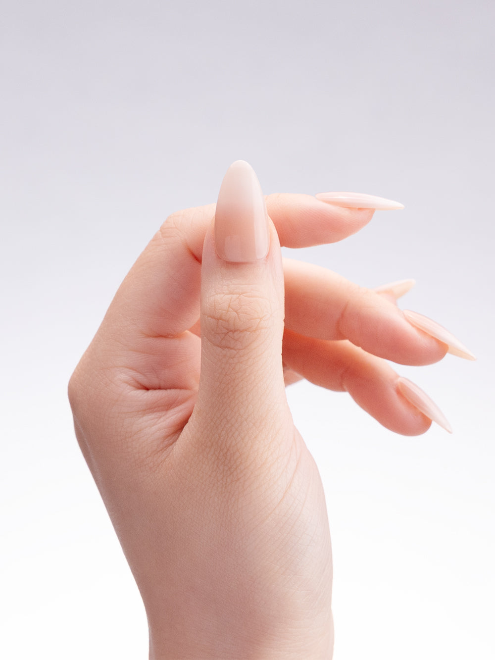 2. Remove the protective film, place the false nail about 1 mm from the base of the natural nail, tilt it at a 45° angle, then slowly lower it while pressing firmly.