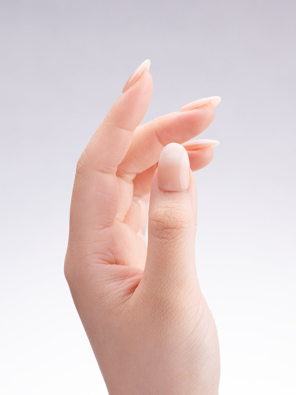 2. Remove the protective film, place the false nail about 1 mm from the base of the natural nail, tilt it at a 45° angle, then slowly lower it while pressing firmly.