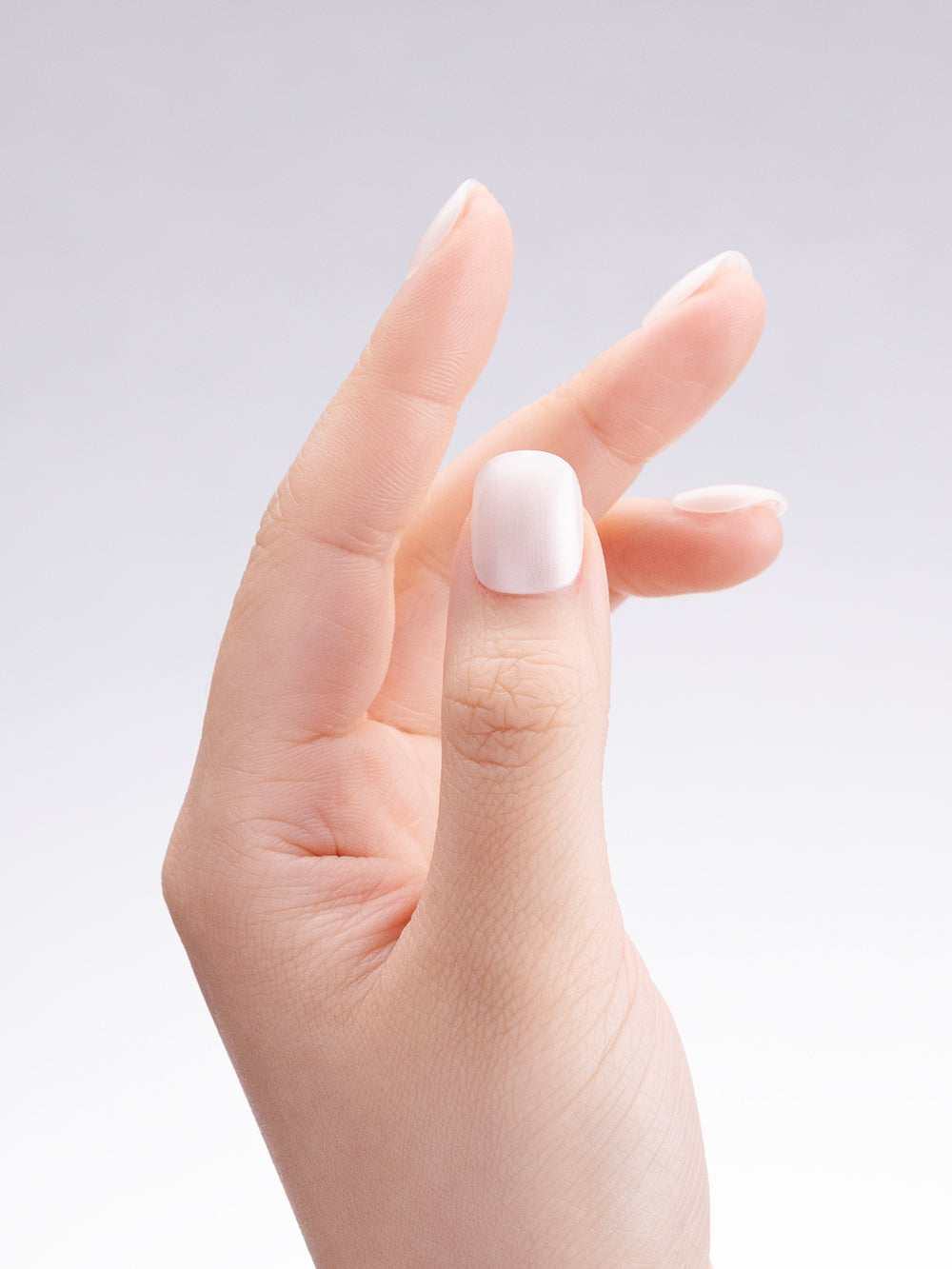 2. Remove the protective film, place the false nail about 1 mm from the base of the natural nail, tilt it at a 45° angle, then slowly lower it while pressing firmly.